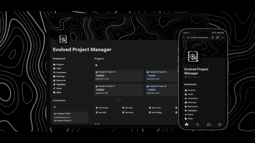 The “Evolved Project Manager” template in Notion is the ultimate solution to manage projects efficiently and professionally. Designed to maximize your productivity, this template integrates all the necessary tools to plan, execute and track your projects from a single platform.