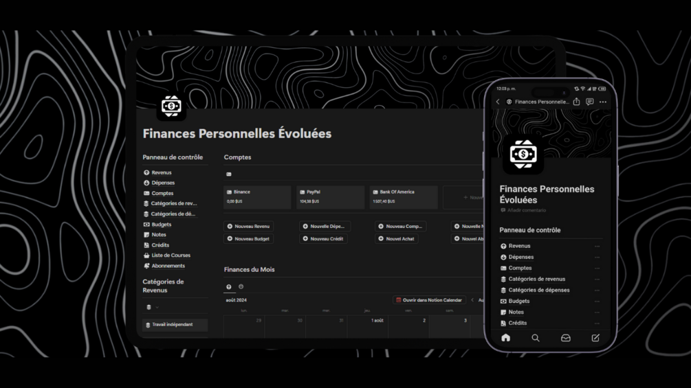Le modèle « Personal Finance Evolved » de Notion est l'outil ultime pour optimiser votre gestion financière quotidienne et atteindre vos objectifs financiers. Conçu pour vous donner une vue d'ensemble claire et détaillée de vos finances, ce modèle couvre tout ce dont vous avez besoin pour prendre le contrôle de votre argent de manière organisée et efficace.