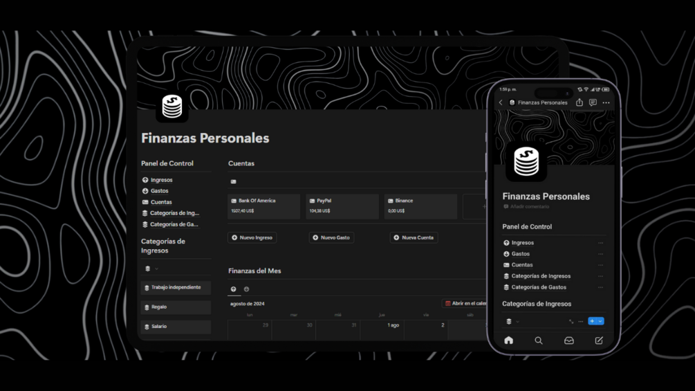 "Finanzas Personales" es la plantilla ideal para cualquier persona que quiera mejorar su manejo del dinero y lograr una mayor estabilidad financiera. Con esta herramienta en Notion, mantén tus finanzas organizadas y trabaja hacia tus metas económicas con confianza.