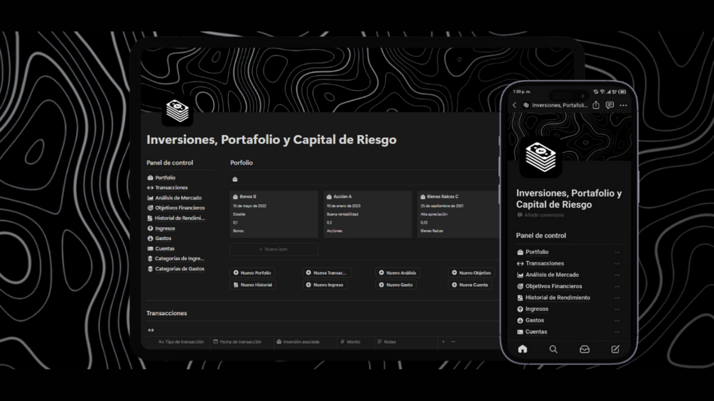 La plantilla "Inversiones, Portafolio y Capital de Riesgo" en Notion es una herramienta completa diseñada para inversores que buscan llevar un control preciso y estratégico de sus inversiones. Ideal para quienes gestionan un portafolio diverso o están involucrados en capital de riesgo, esta plantilla te permite monitorear y optimizar cada aspecto de tus finanzas.