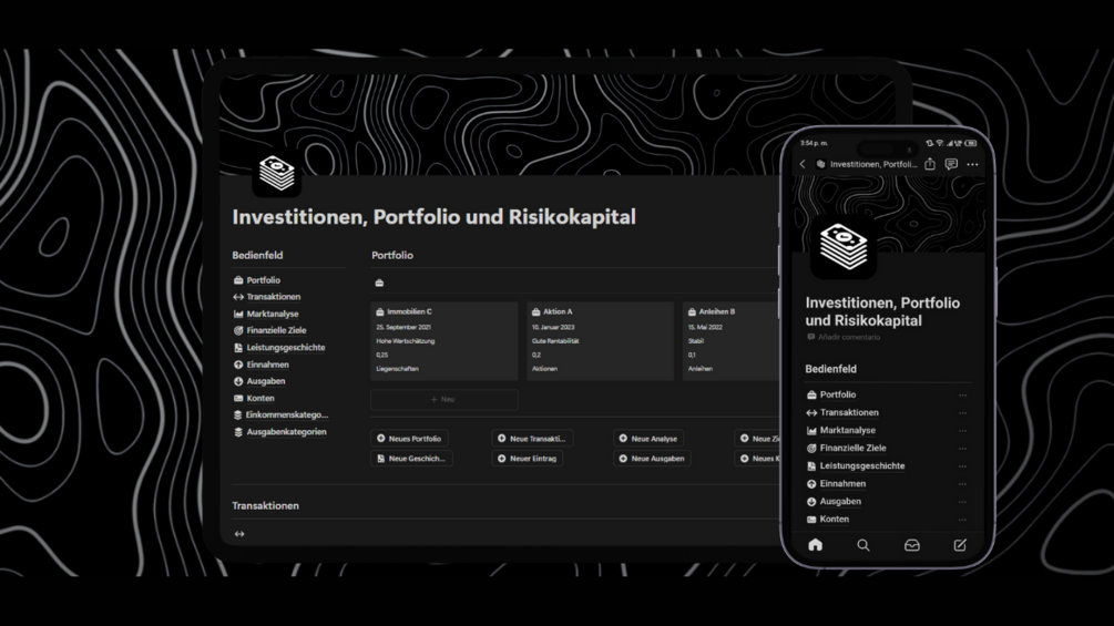 „Investitionen, Portfolio und Risikokapital ist die perfekte Vorlage für Investoren, die die Effizienz und Rentabilität ihrer Portfolios maximieren möchten. Mit diesem Tool in Notion behalten Sie den Überblick über Ihre Finanzen und treffen fundierte Investitionsentscheidungen, um Ihre finanziellen Ziele zu erreichen.